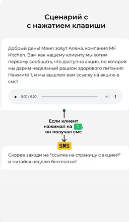 Создать робота для бизнесаНашему роботу можно отвечать словами, а можно — с помощью нажатия клавиш в тональном режиме. Чтобы выбрать способ ответа, мы провели тест: 1450 клиентам MediaPro звонил и предлагал нажать цифру, а у других 1450 клиентов спрашивал, интересно ли им предложение, и распознавал ответ. Конверсия оказалась выше с нажатием клавиши: 21,5% против 7%. Оставшимся 8731 клиенту MediaPro звонил по сценарию с нажатием.