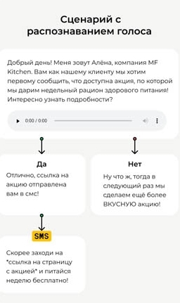 Робот реанимировал старую клиентскую базу "Доставка еды". За два дня он обзвонил 11 тыс. человек и привёл 81 заказ. Голосовая рассылка стоила компании 15.000 рублей и окупилась в 32 раза.